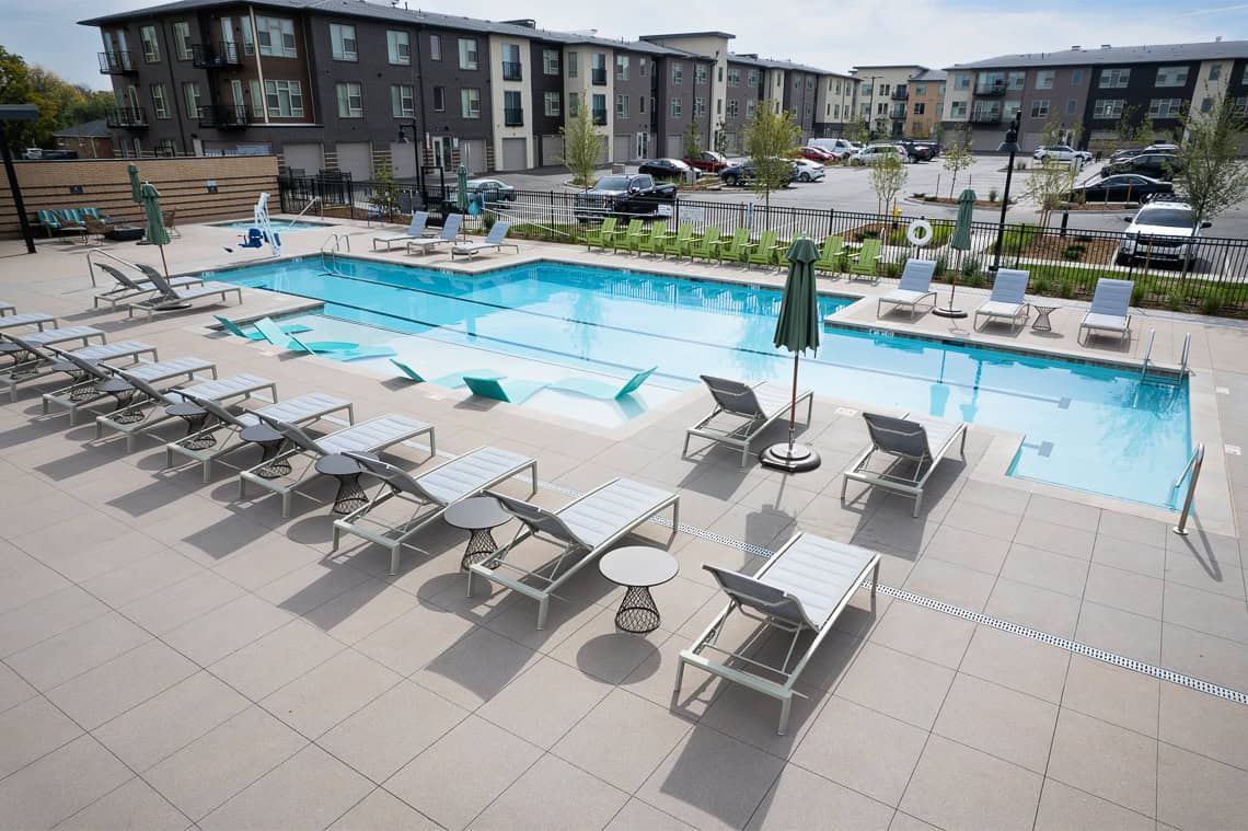 Distant perspective of Sandscape Refined coping and pool deck at apartment complex.
